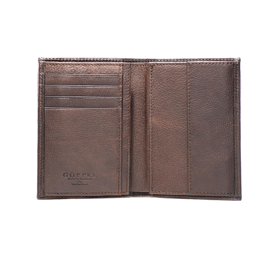 Scheintasche im Hochformat, Münzfach rechts, 10 Karten- und Steckfächer, Klappe mit Klarsichtfach, 2 Scheinfächer, RFID Schutzfolie, Maße 9 x 12,5 cm